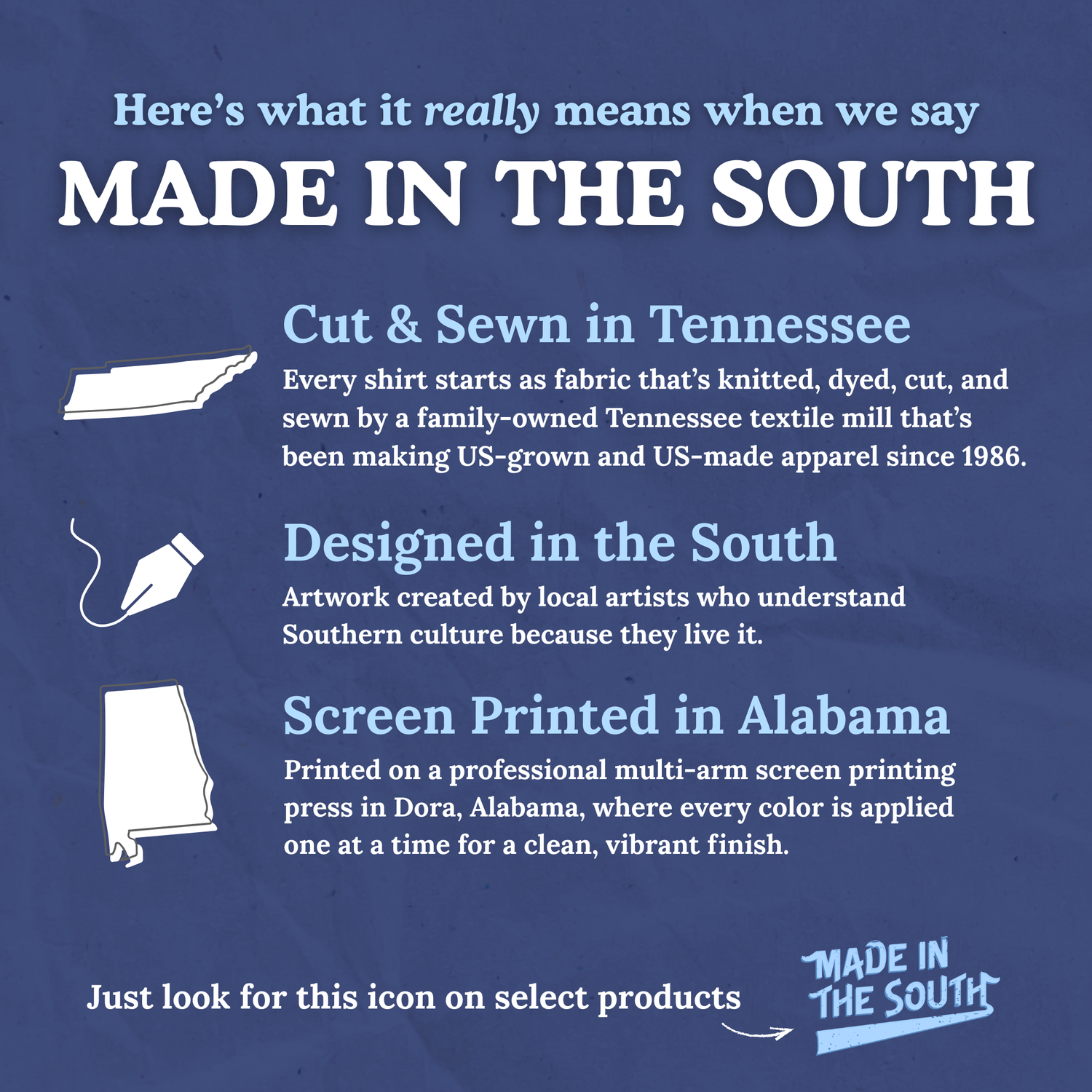 Look for the “Made in the South” icon on select products. It means the design and manufacturing both happened right here in the South. It’s our way of keeping work close to home and celebrating Southern craftsmanship in every stitch.