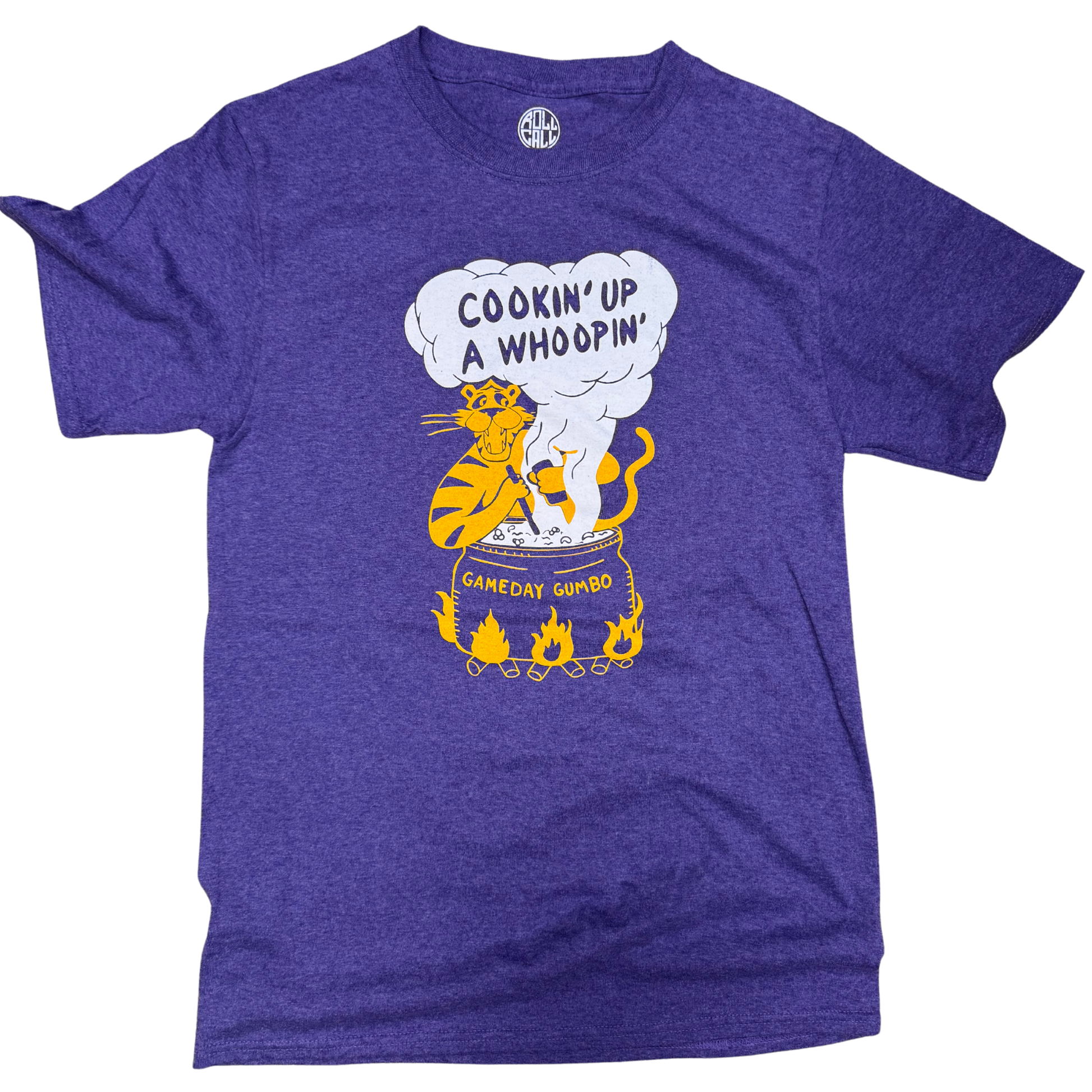Serve up some Louisiana pride with a side of swagger. This bold purple tee features a feisty tiger stirring a steaming pot of Gameday Gumbo with the warning: Cookin’ Up a Whoopin’. Perfect for fans who bring the heat both in the kitchen and on the field.