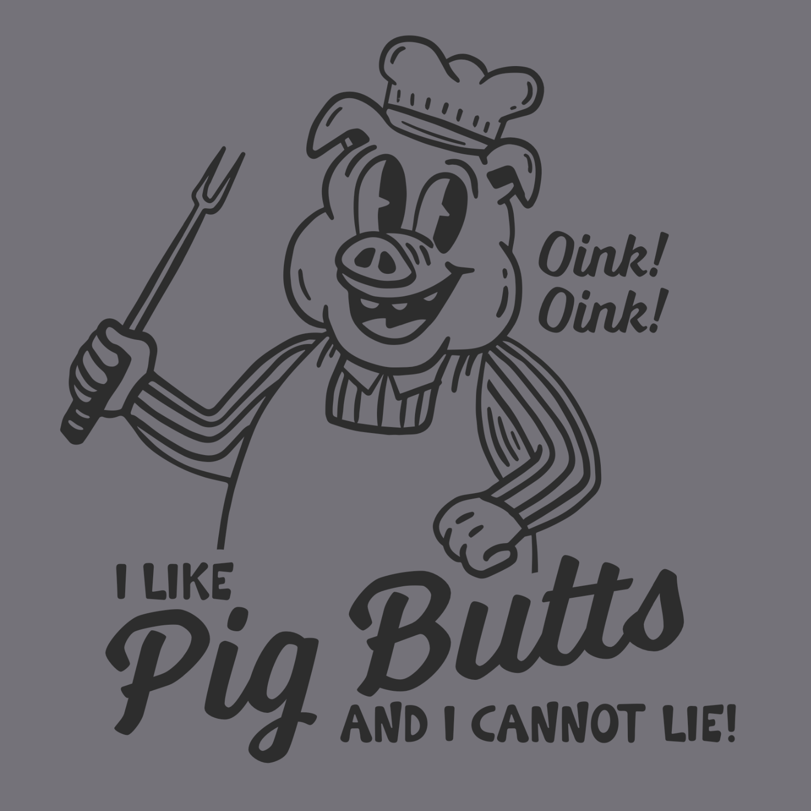 Featuring a cartoon chef pig straight out of a Southern BBQ joint sign, this tee proudly declares your love for smokey, slow-cooked rear ends the way nature—and the pitmaster—intended. Screen printed in matte black on a dark heather gray tee, it’s a subtle nod to big flavor and juicy butts.