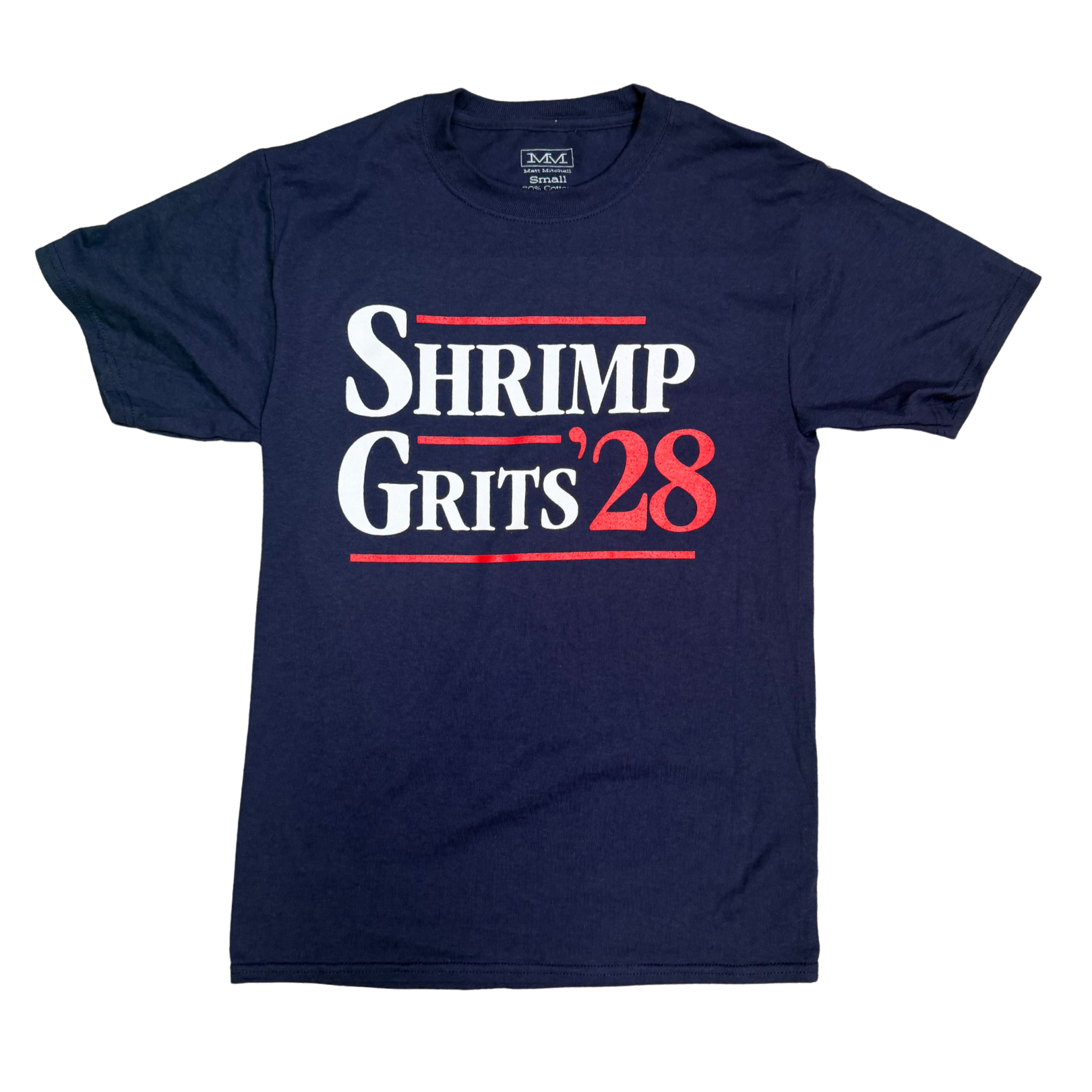 The Shrimp & Grits ’28 tee is a parody of the classic Reagan/Bush campaign logo, redesigned to support the only ticket with a proven track record of bipartisan approval: creamy grits and perfectly seasoned shrimp. Same bold, patriotic layout. Same red-white-and-blue energy. Zero mudslinging — just butter, garlic, and victory.
