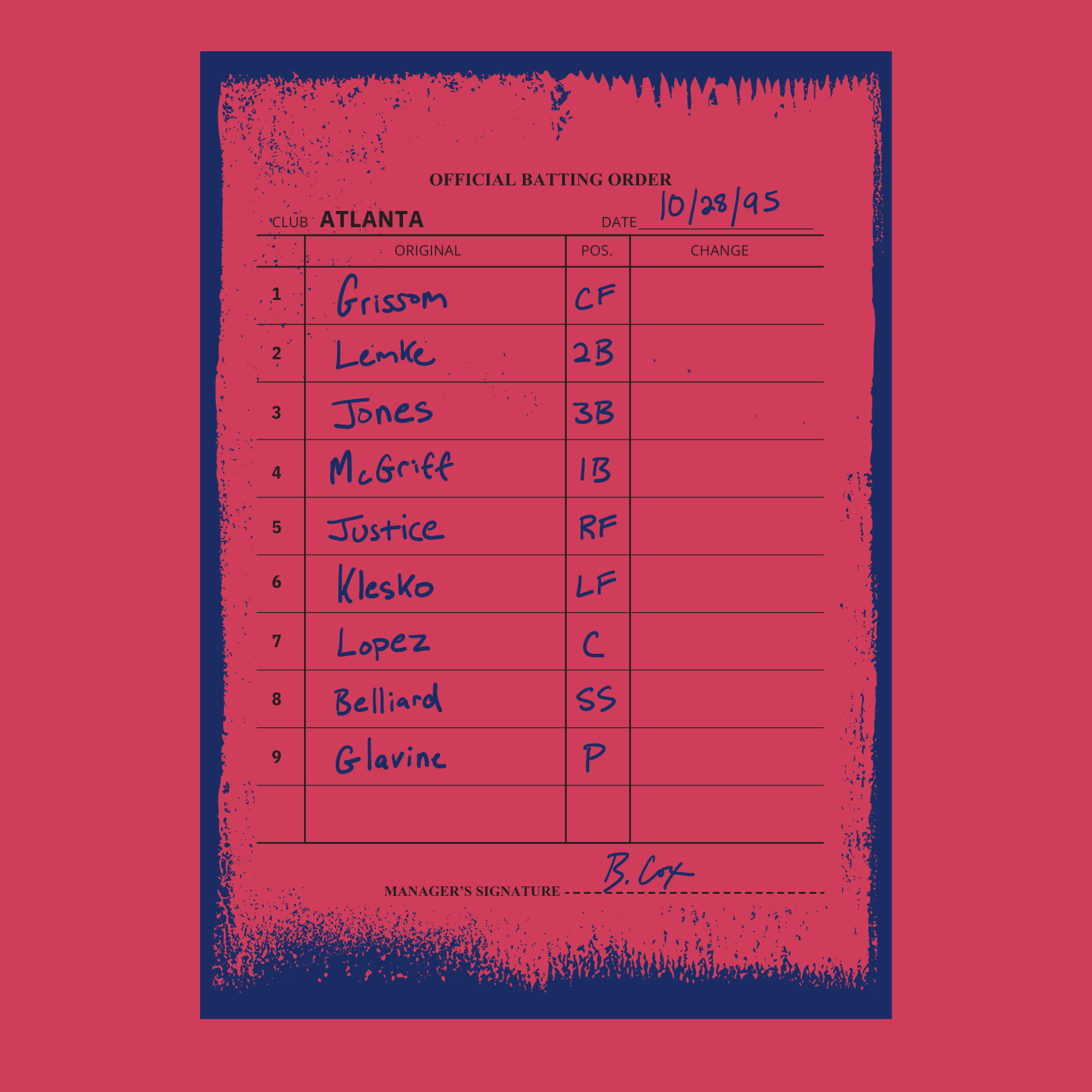 Cool air, October baseball, and a lineup full of names that still feel like old friends. The kind you can still recite without thinking if you grew up anywhere within shouting distance of a Braves game on the radio or TBS humming in the background.