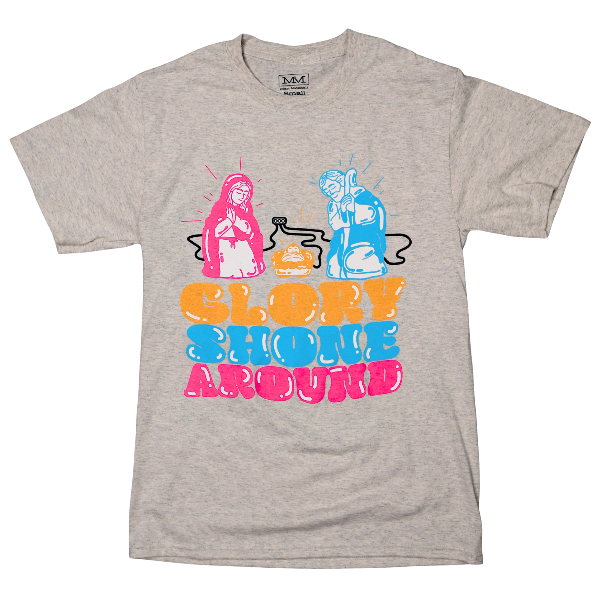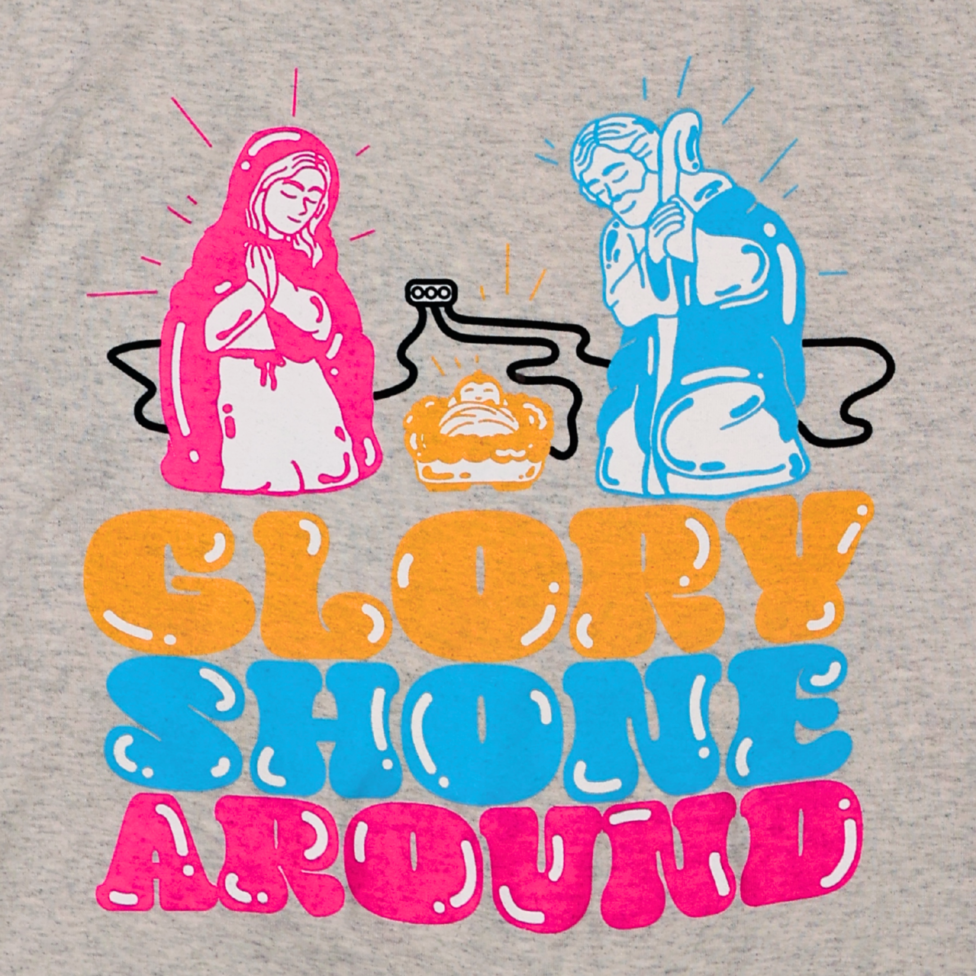 Celebrate the season Southern-style with our “Glory Shone Around” Christmas tee, inspired by the beloved line from the old gospel classic “While Shepherds Watched Their Flocks.” This design brings that vintage lyric to life through a delightfully kitschy blow-mold nativity scene—bright, glowing, and dripping with the kind of retro charm that instantly feels like home. Illustrated by Jonathan Fox of WoTown Art in Warrior, Alabama, the artwork pops with hot-pink, sky-blue, and sunshine-yellow inks that look straight off a 1970s Christmas catalog. Each shirt is screen printed by Bama Print House in Dora, Alabama, layering color by color for that deep, tactile print you just don’t see much anymore. Printed on an oatmeal heather 50/50 cotton/poly blend, it’s soft, lightweight, and perfect for everything from church Christmas programs to tree-lightings to sipping cocoa on the couch while pretending you’re not responsible for assembling anything. A little nostalgic, a little joyful, and unmistakably Southern—just like Christmas should be.