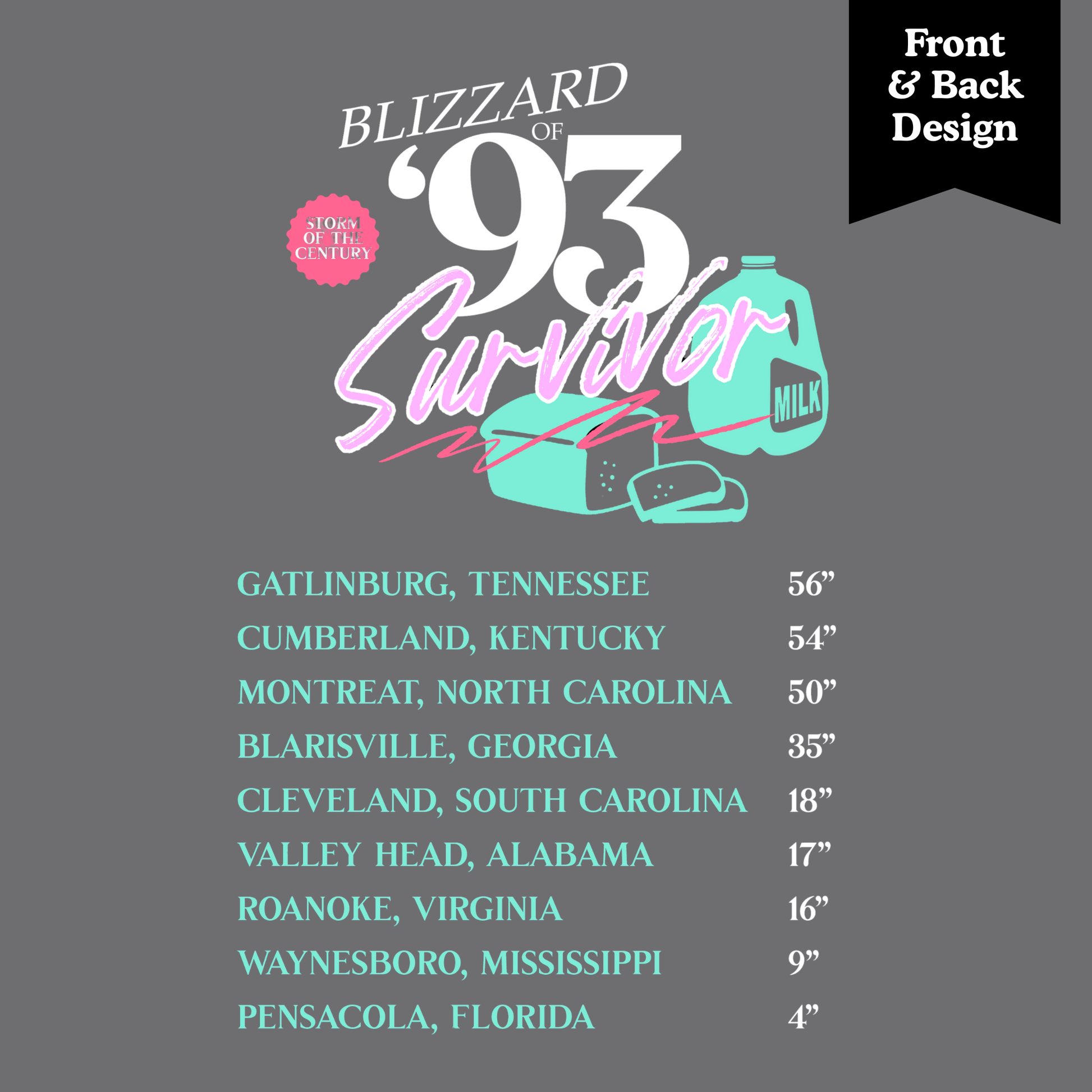 Front print features the Blizzard of ’93 Survivor graphic with iconic Southern staples—milk, bread, and eggs—in vintage neon tones.