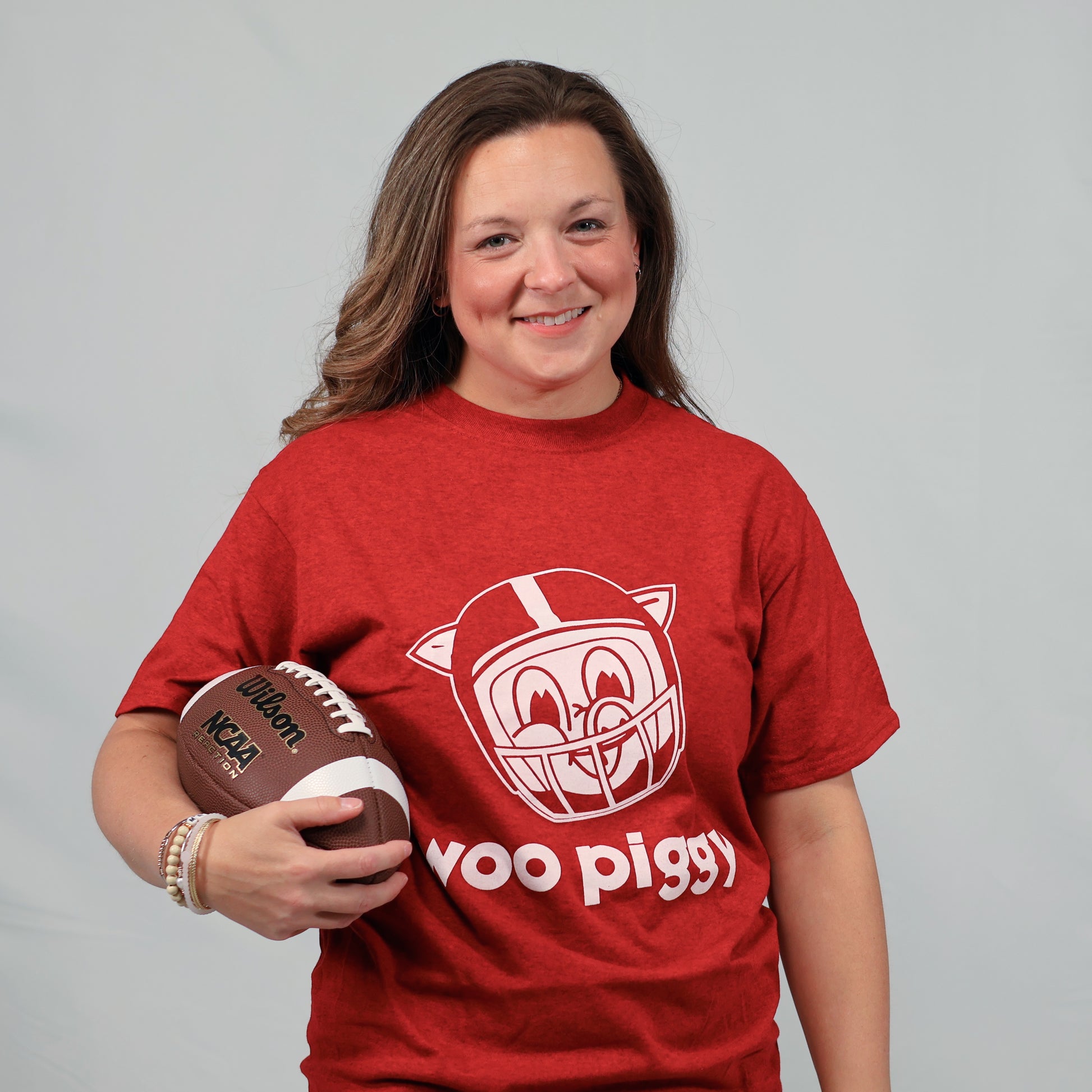 Cheer on your team in style with a throwback twist. This crimson shirt features a cheerful pig ready for gameday, complete with a vintage-style helmet and a grin that says, “we’re havin’ fun no matter what the score is.”